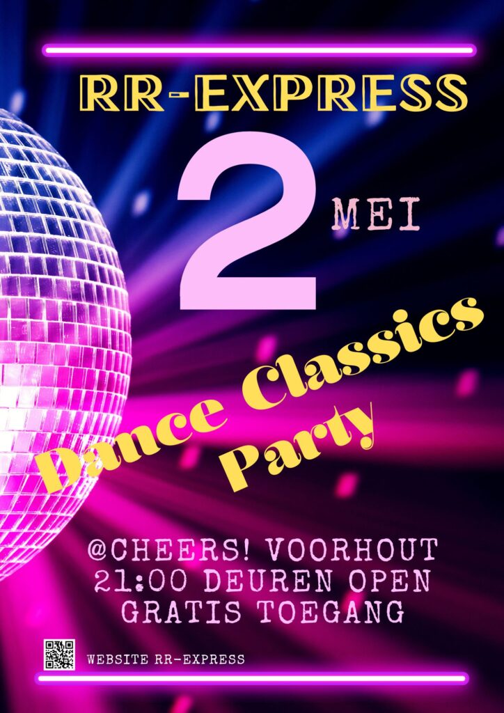 Rob en René (RR) zijn gek van dans muziek. Onder het motto ”Without music life would be a mistake” (Friedrich Nietzsche) willen we dit verder vormgeven door dansfeesten te organiseren voor iedereen vanaf 25 jaar. RR Express draait de beste dansplaten van toen en nu. Uitgangspunt is een gezellige avond te hebben en te genieten van goede muziek die lekker swingt en de drukte van alle dag even doet vergeten. Op onze playlist staan Earth, Wind and Fire, KC and the Sunshine band, Rose Royce, Haddaway, 2 Unlimited, The Black Eyed Peas, Robin Thicke, Avicii en vele, vele anderen…
